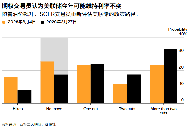 在各类政策情景中,维持利率不变已成为最可能的单一结果。据亚特兰大联储数据显示,其他情景中,一次降息(25个基点)的概率为24%,两次降息的概率为12%。交易员甚至认为加息的概率高达16%,较上周五(伊朗冲突爆发前最后一个交易日)的8%显著攀升。这些数据均基于与美联储政策利率挂钩的担保隔夜融资利率(SOFR)期货期权计算得出。
